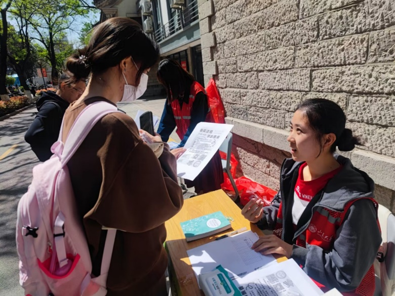在活动过程中,团队成员分头行动,以扩大宣传范围。有人在展台处积极宣传:一边向路人发放宣传单,一边对咨询活动相关事宜的同学进行耐心解答、同时提醒暂存或借阅书籍的同学做好信息登记并扫码加入活动群。队伍其他成员则走向了人流量更大的区域继续发放宣传单,积极宣传并介绍“春风送暖·书韵飘香”的活动目的及活动内容,呼吁同学们加入到这一活动中来。