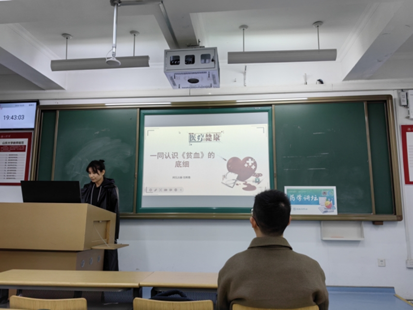 接着,陈超选择了Ⅱ型糖尿病靶向治疗药物的研究进展作为展示主题。首先他介绍了Ⅱ型糖尿病的发病机制及特点,之后围绕基于肠促胰岛素和基于葡糖代谢途径的靶点和治疗药物着重展开。阿瓦古丽介绍的主题是贫血,她从如何从化验单知晓患者贫血引入,介绍了贫血的原因,同时展示了贫血的危害,也为同学们提供了治疗和防范的方法。陈子强选择疫苗抗癌这一热点主题,通过与癌症传统疗法进行对比,突出了癌症疫苗的优点,从宏观上介绍了癌症疫苗的发展。