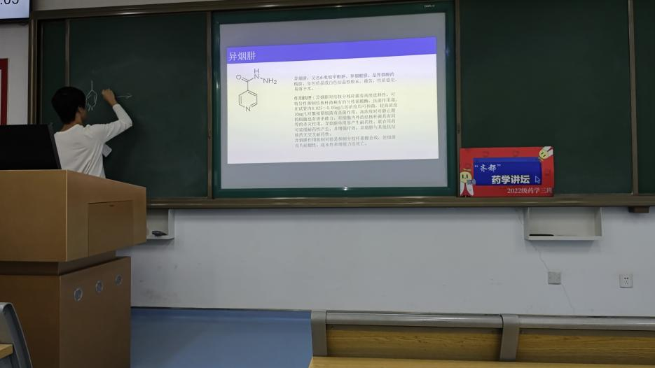 然后,黄雨欣以“你了解抑郁症吗”为开端,分别讲述了抑郁症的症状、发生率、治疗以及抑郁症药物市场现状,并介绍了五种自救手段;孔维瀚演讲的题目是《两种药物的合成》,他以板书以及与观众互动的形式,生动形象地讲解了两种药物——异烟肼和乙胺丁醇的合成。