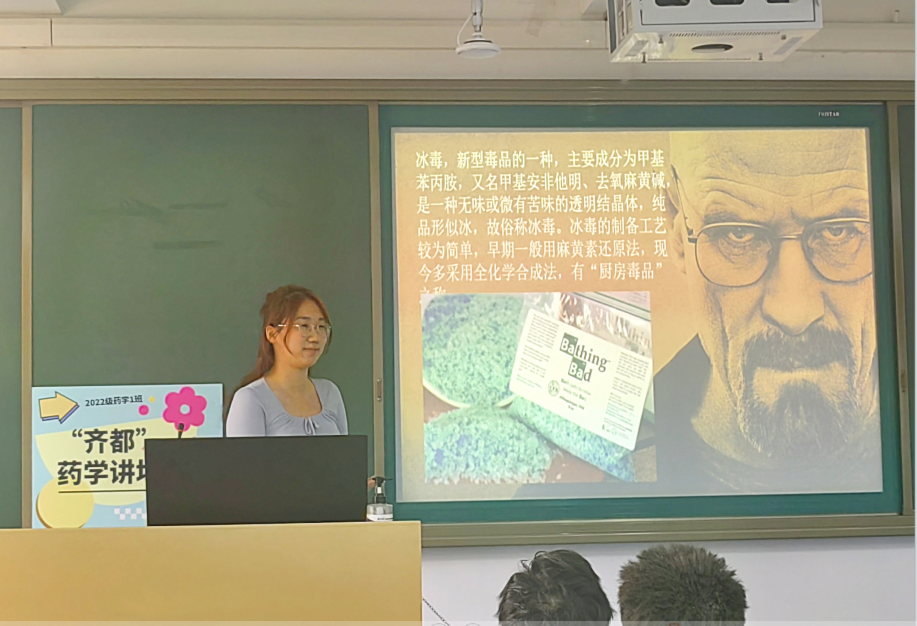 最后,滕炜琳以“汝之砒霜,彼之蜜糖”为主题,为大家科普了药物不良反应ADR的分类及出现原因;徐砻宸向同学们介绍了冰毒的制毒方式和所用原料,并强调了冰毒的危害。