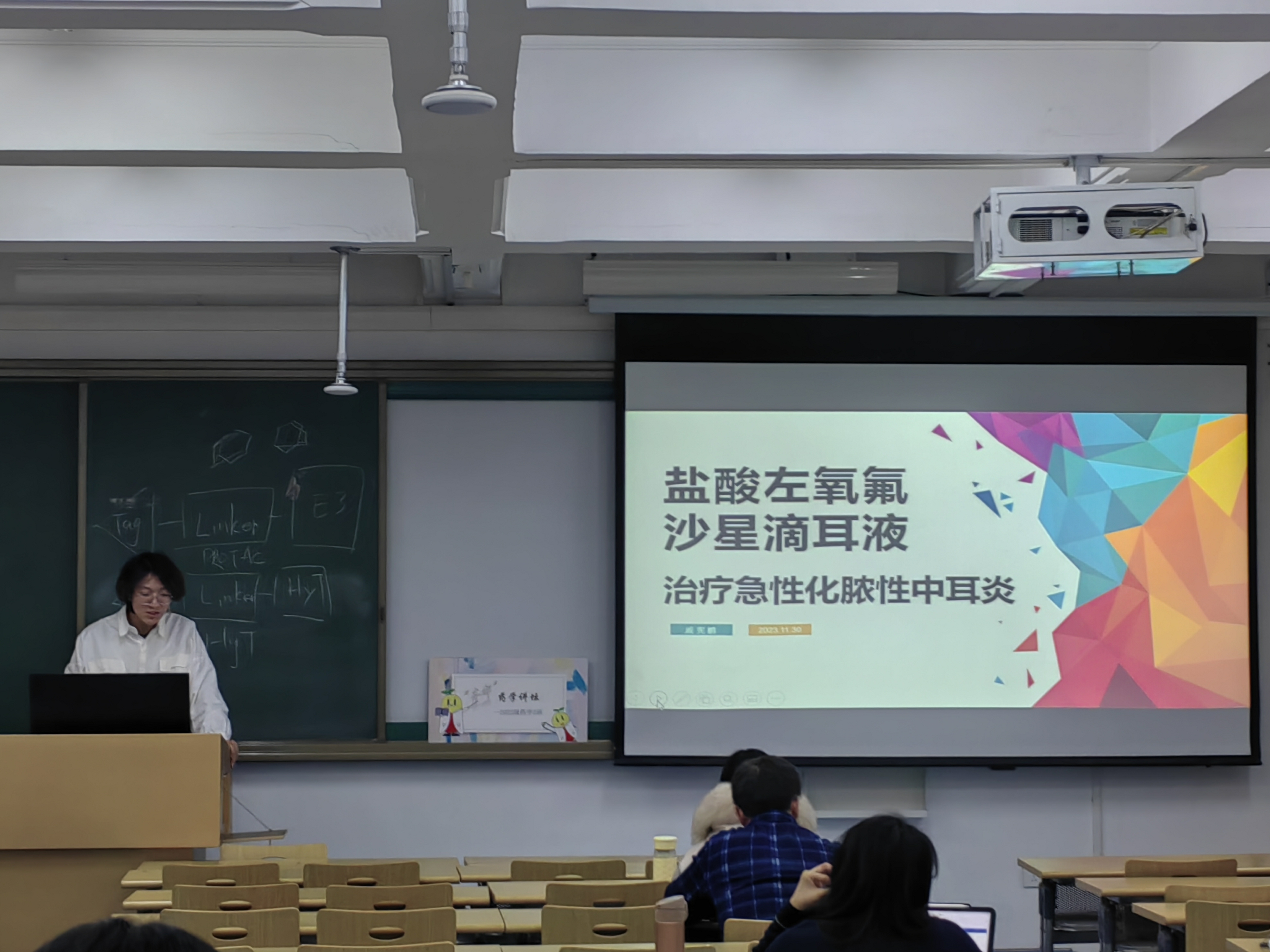 第五位演讲人戚宪鹏演讲的题目是《中耳炎的这些那些》。他先以亲身经历引入,介绍了急性化脓性中耳炎的感染机制;并指出了左氧氟沙星在治疗中耳炎方面的显著作用,介绍了它的作用机理。