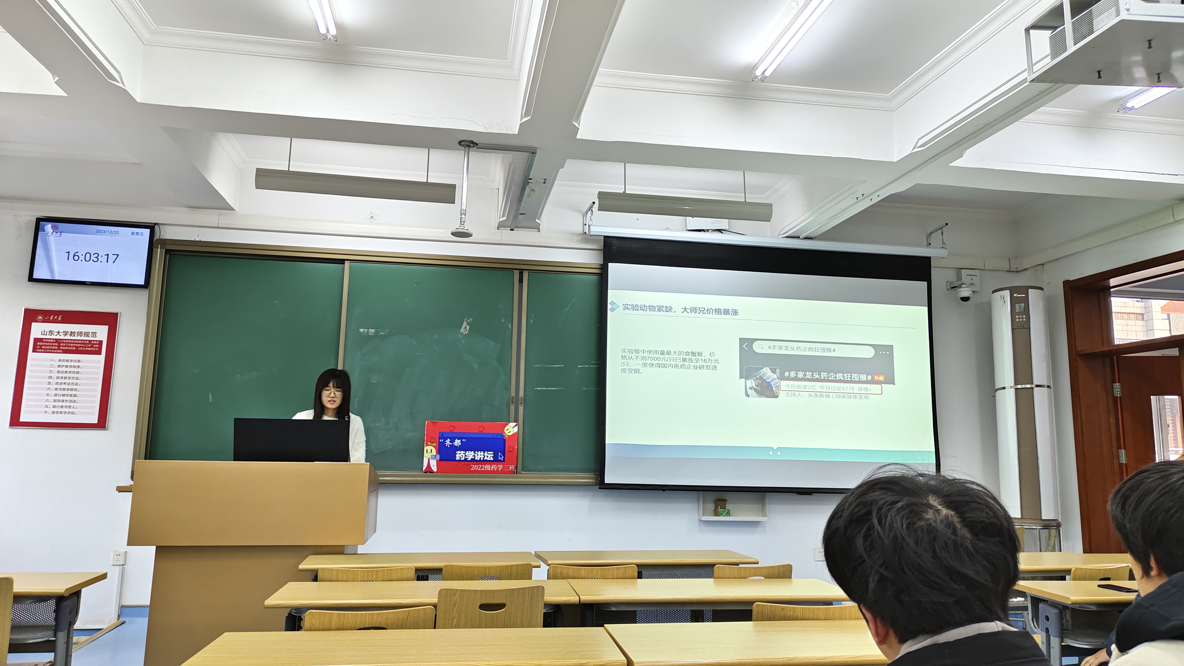 12月22日下午16时,米乐·M6(China)官方网站2022级3班于趵突泉校区图东202教室举行了第六期药学讲坛。本次药学讲坛由张晓晴主持,袁思雨、张晓晴、张雨欣、郑航、祝芷郁、王倩六位同学作为主讲人,徐文忠、马朝作为嘉宾出席。