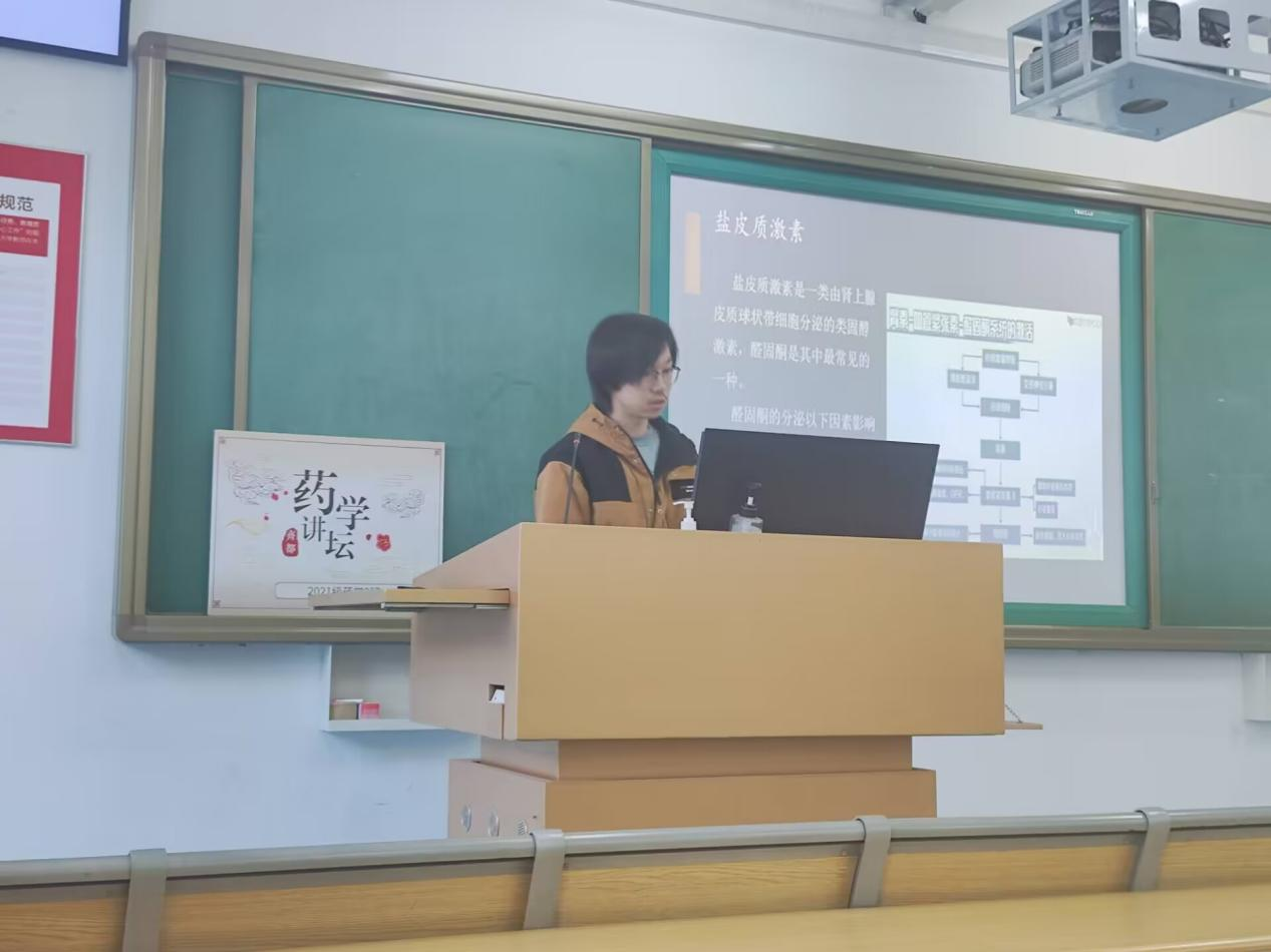 紧接着,原宏成向同学们讲解了盐皮质激素受体拮抗剂在糖尿病肾病治疗中的应用,并以此为基础向同学们分享了三种相关药物以及它们的长处与不足。之后,王曼宇以《β-D葡萄糖醛酸苷酶显色底物的绿色高效合成》为题,讲述了β-D葡萄糖醛酸苷酶的作用以及其显色底物绿色合成的优化方法。