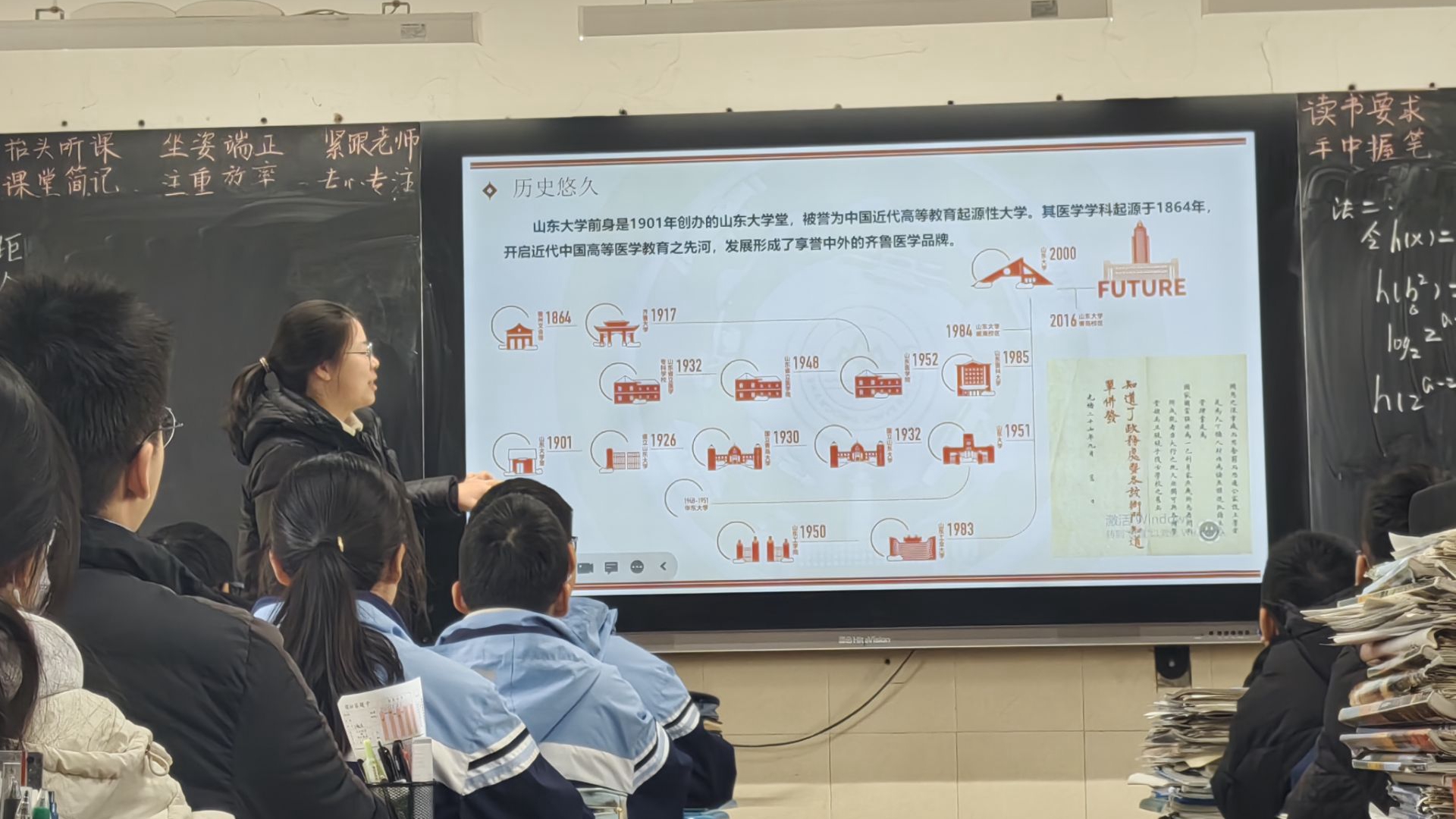 首先,孟舟为同学们播放了山东大学宣传片,让同学们对山东大学有了初步的了解,提高了他们参与的积极性。接着,她以PPT为纲,从学校背景、教学方式、特色专业、招生录取几个方面介绍了山东大学的诸多优势,其中重点介绍了山东大学的学科分类、强基计划和综合评价的招生与报名工作流程等。同时,她也向同学们展示了山东大学四季的美丽景色、各校区的风采和精彩的学校活动。