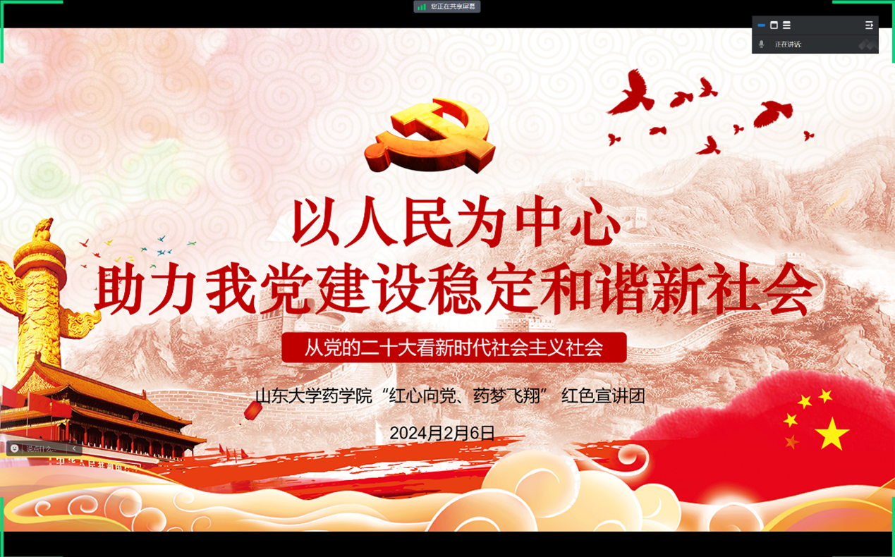 为深入贯彻党的二十大精神,领会其重要意义和深刻内涵,2月6日晚20时30分,米乐·M6(China)官方网站“红心向党,药梦飞翔”宣讲团举办了线上宣讲活动。本次宣讲活动由石钟灵主持,吴珂瑜担任主讲人,米乐·M6(China)官方网站先锋社部分成员参加。