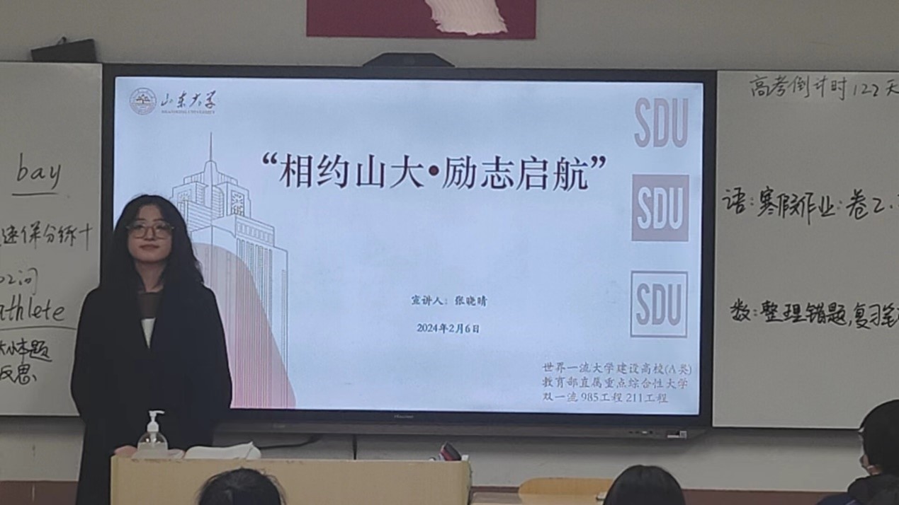首先,张晓晴以宣传视频开场,通过招生办发布的视频生动形象地展现了山东大学的景观建设、人文关怀、科研硕果等内容。展示了山东大学的独特魅力。