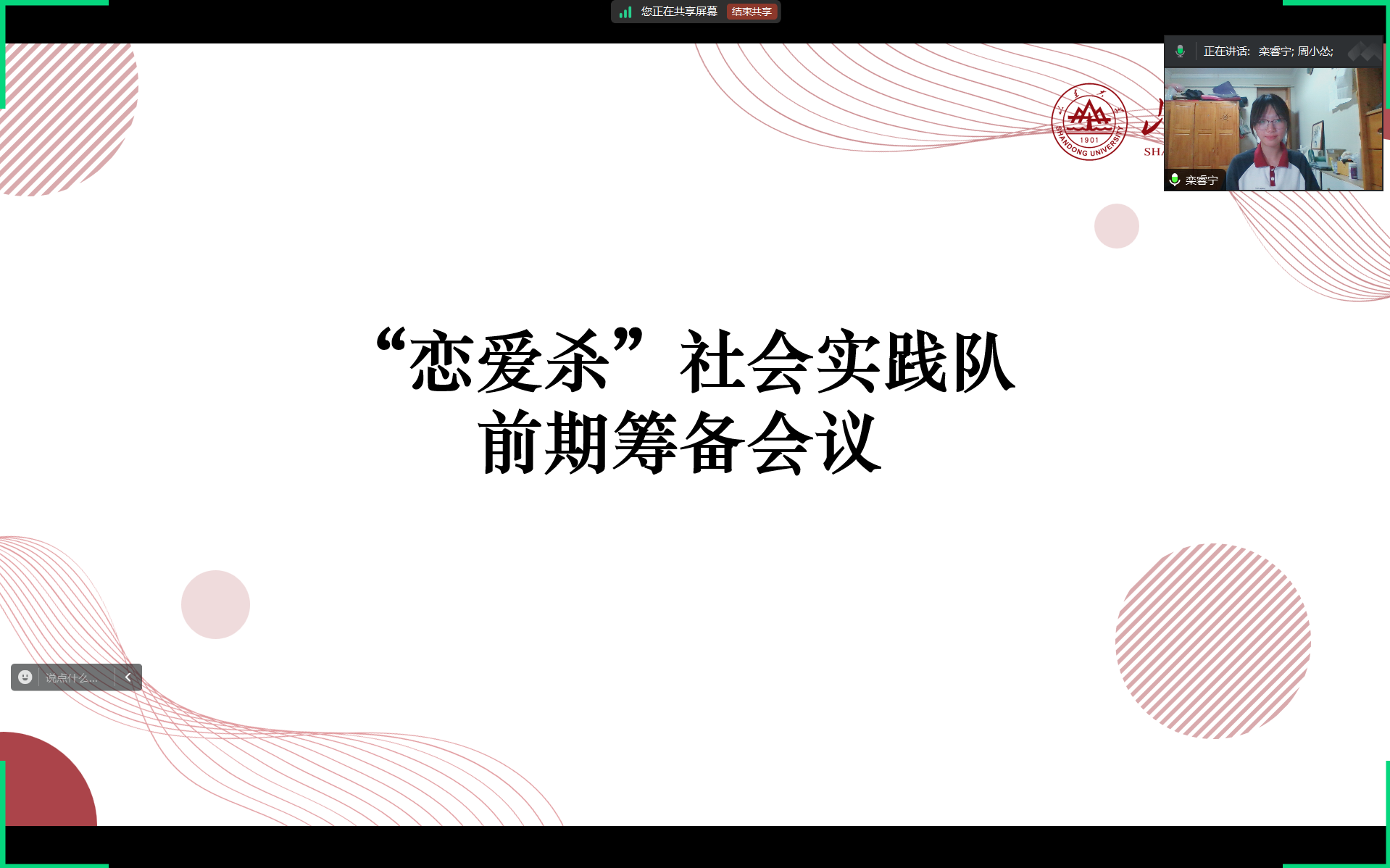 会议伊始,栾睿宁介绍了本次社会实践的主要目的——以大学生在恋爱方面出现的隐性问题(如性病感染、流产堕胎和心理畸形)为调查对象,进行调研、分析和宣传教育等,树立正确恋爱观,守护大学生恋爱方面的心理健康。