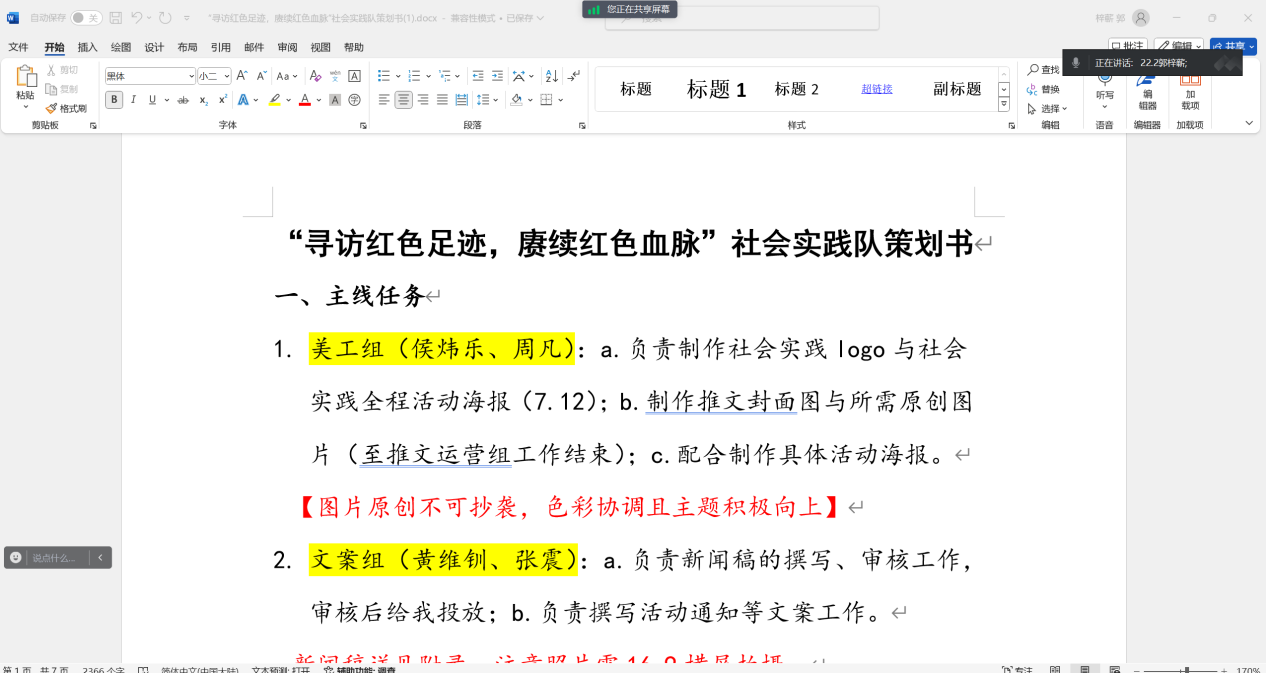 紧接着,郭梓蕲向各位成员讲解了本次社会实践的时间与流程。本次社会实践将于7月15日至8月15日以线上线下相结合的方式开展。团队将采取社区宣讲、红色遗址走访调查、电台录制等多种形式宣传红色精神,传播革命文化,了解社会实践背景与现状,并希望能引起社会各界广泛关注。同时,郭梓蕲强调了社会实践宣传的重要性,指出社会实践不仅需要做出来,还需要让大家看得到。为此团队采取了撰写推文、发布新闻稿、利用媒体平台等渠道进行宣传,积极探索宣传社会实践的渠道。