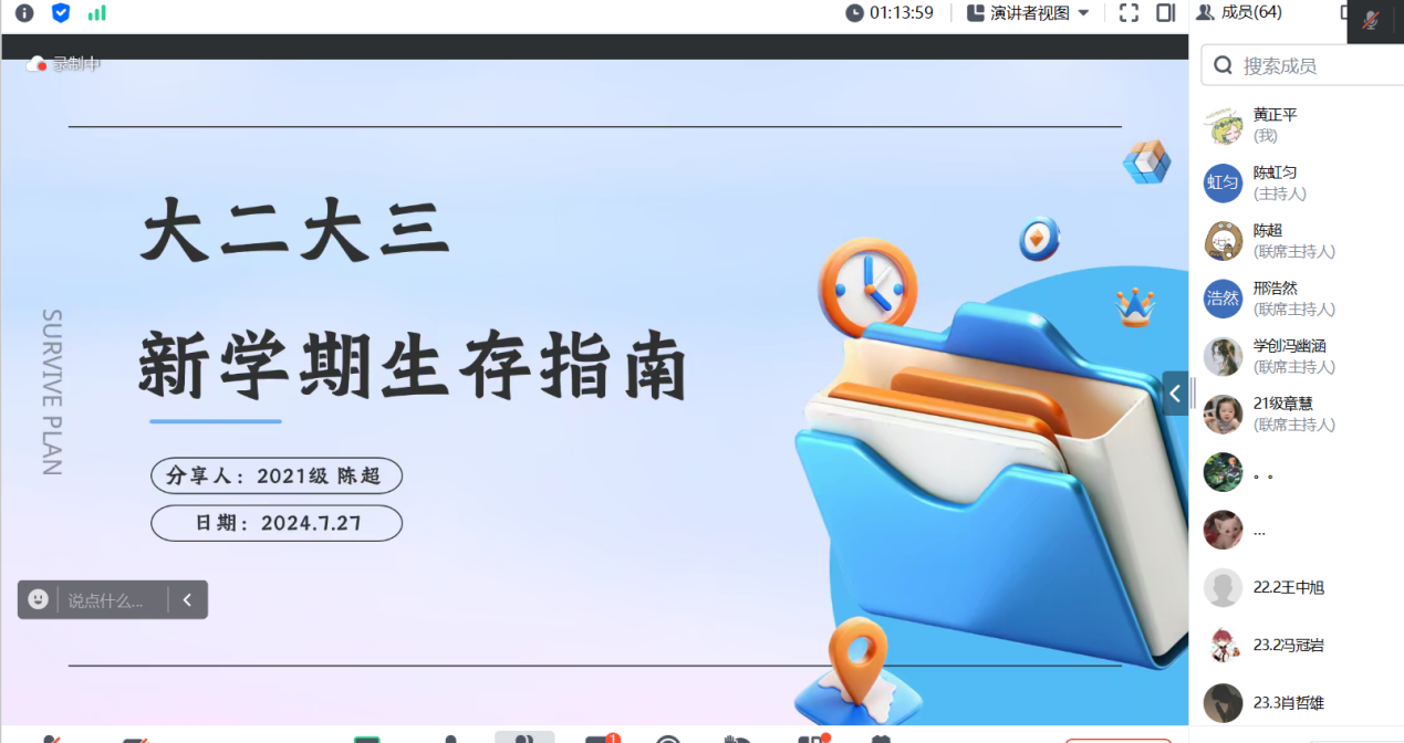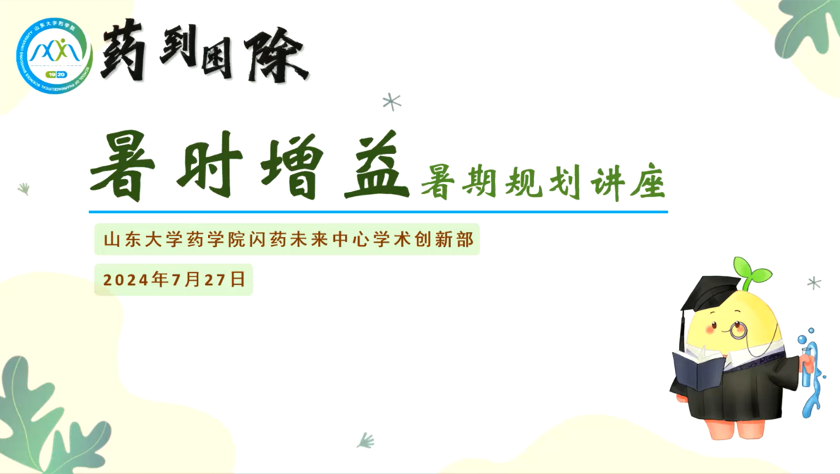 7月27日,由米乐·M6(China)官方网站闪药未来中心学术创新部主办的“药到困除”暑时增益讲座以线上腾讯会议形式开展。此次活动旨在发挥优秀学子的模范引领作用,帮助学生们合理规划假期生活,在假期更好的提升自我,使学生们尽早了解大二、大三的学习生活,树立信心,找准方向。本次活动邀请到贾宇哲、孔美秋、陈超、章慧、邢浩然、胡玉婷六位优秀学生代表分享学习经验,米乐·M6(China)官方网站2021级临床药学本科生、2022级本科生、2023级本科生参与活动。
