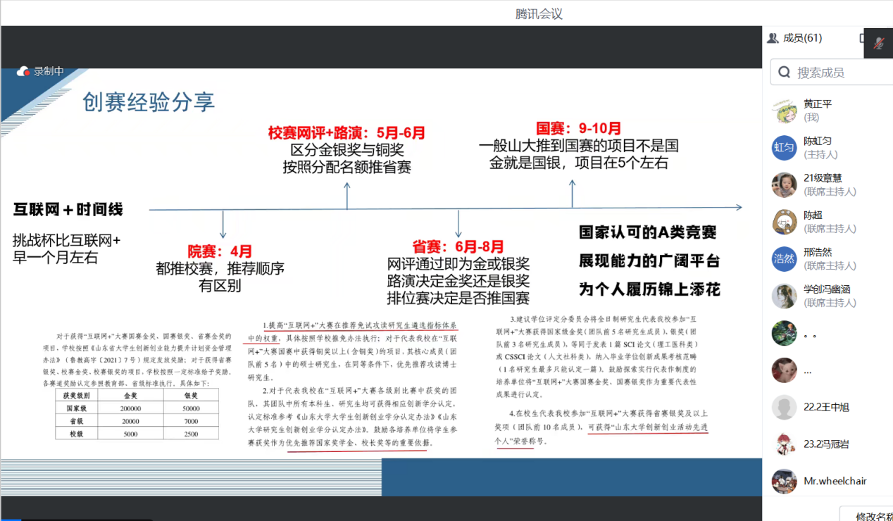 章慧结合自身丰富的创赛经历,着重展示了双创赛事的内容,从时间安排、项目选择、团队组建、材料准备等多个方面分享了创赛经验。她表示,创新创业赛事对自身统筹规划、交流沟通等多项能力都是很好的锻炼,学有余力的学生可以抓住此类机会,为大学生活增添更精彩的一笔。