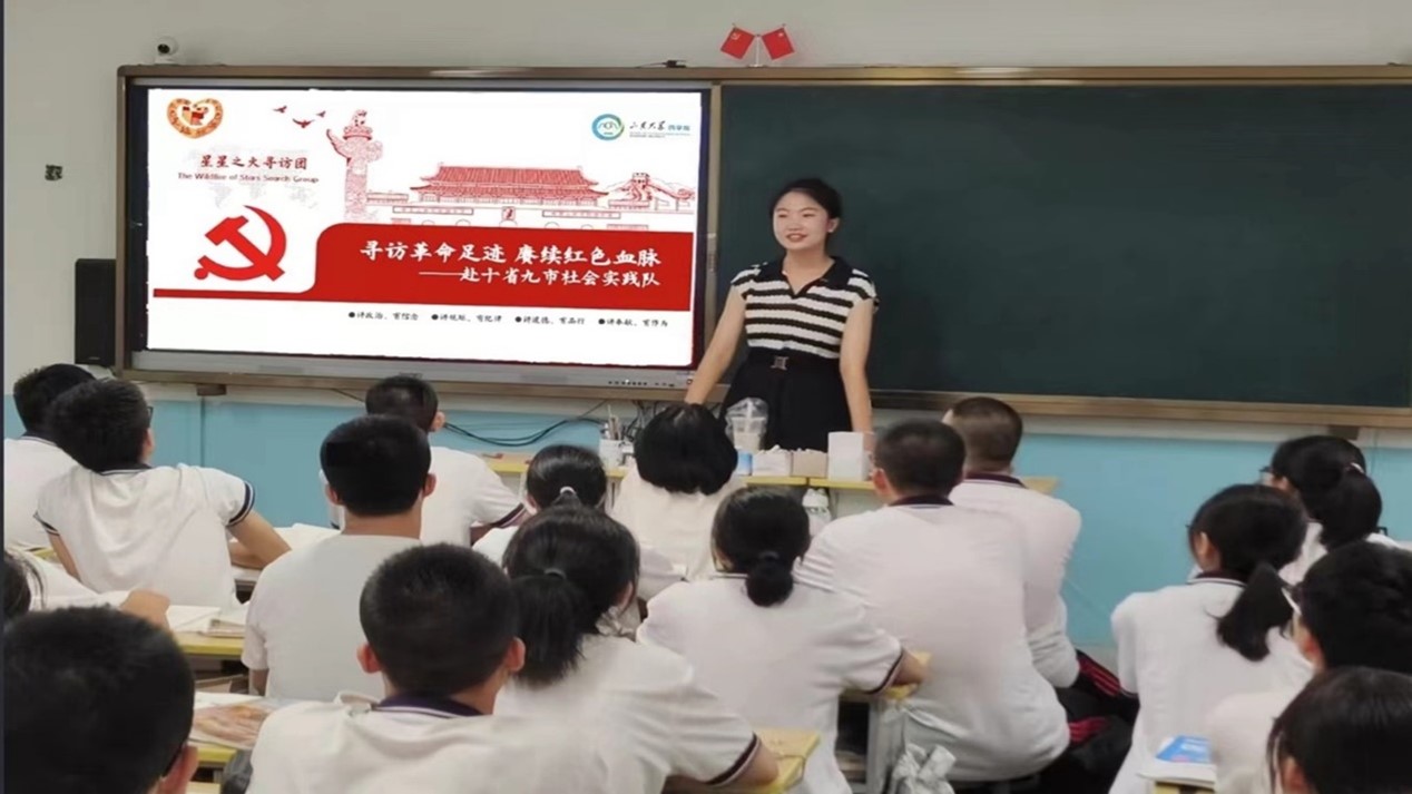 8月17日,在大同市左云县,“星星之火寻访团”实践队员秦秀雯回到自己的高中母校进行了 “寻访红色足迹,赓续红色血脉”主题宣讲。