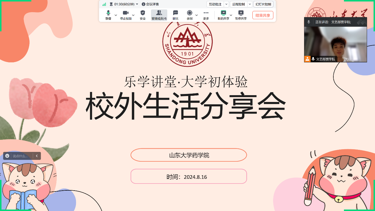 随后,贾宇航向新生们介绍了济南的旅游景点,趵突泉、千佛山、山东博物馆等名胜古迹和现代化博物馆,不仅是济南的文化瑰宝,也是新生们拓宽视野、提升文化素养的重要场所。他详细介绍了这些景点的历史背景、特色景观及参观注意事项,鼓励新生们积极参与文化探索。此外,分享会中还向新生介绍了医疗保健、交通出行等实用信息,帮助新生了解周边医疗资源分布情况,规划安全、经济的出行路线。