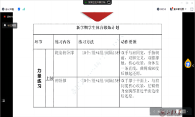 张军以体测为切入点,依次介绍了中长跑、短跑、立定跳远、引体向上、仰卧起坐、坐位体前屈等体测项目的锻炼方法。他结合图片和视频向同学们生动讲解了每个项目的训练动作要领及所锻炼的肌肉区域,同学们在评论区积极讨论。张军亲自示范讲解了引体向上、高抬腿等动作要领及训练方式,鼓励同学们每日坚持锻炼,用健康的体魄和饱满的热情开启大学生活。
