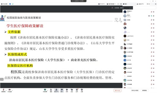 最后,郭加兴带新生们学习了校医院就医流程和医保政策。他具体解释了普通门诊与急诊、校内与校外就医等各类情况的就医流程,解答了医保的缴费与报销方面的问题,并提供了相应的咨询方式,方便同学们解决后期就医上的困难。