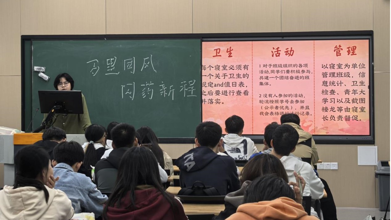 最后,梁雨晨从卫生、活动、管理三个方面来为4班同学介绍班级班规,确立了“宿舍长——班委——辅导员”的传递路线。