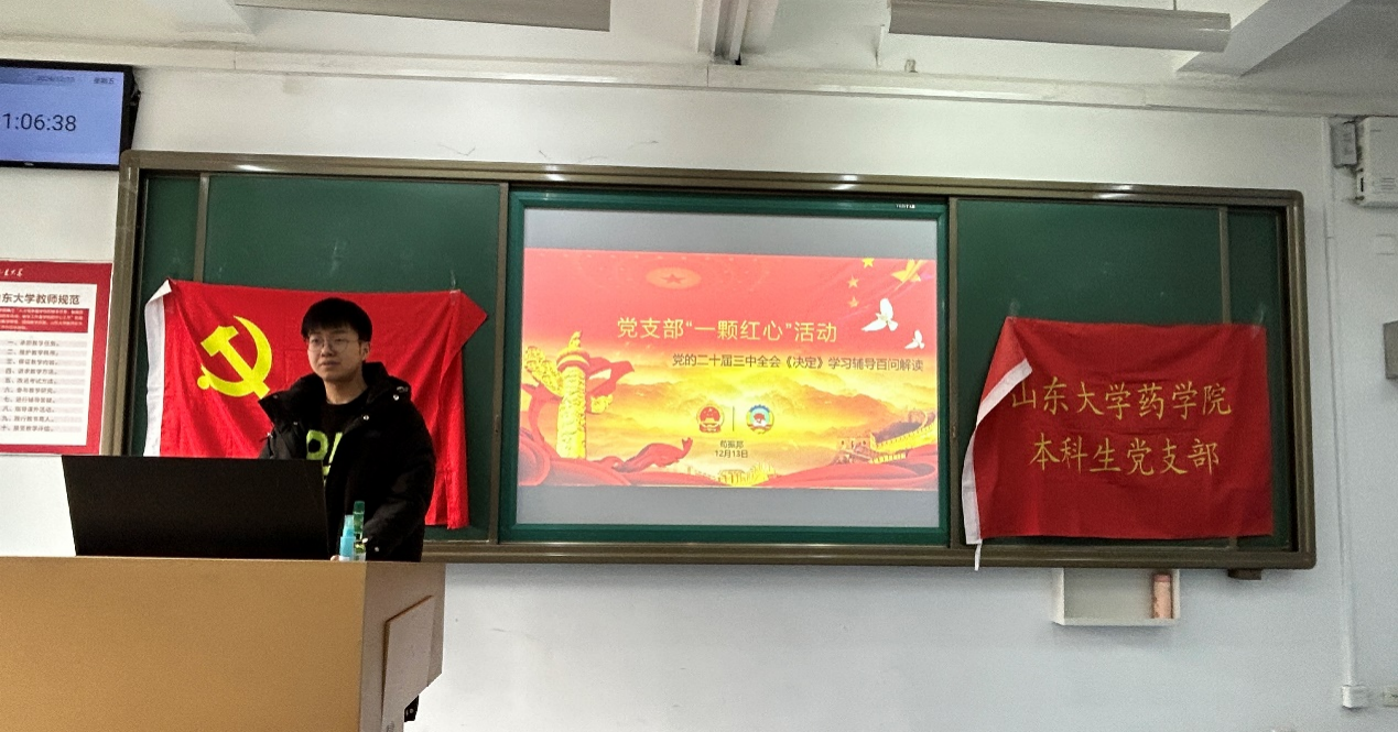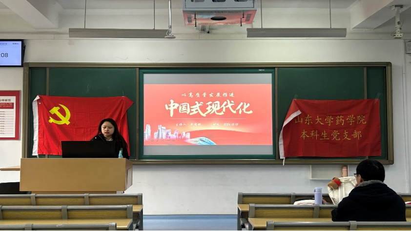 12月13日,米乐·M6(China)官方网站本科生党支部在趵突泉校区图书馆西101教室举办“一颗红心”主题党日学习交流活动。本次活动由本科生党员牟奕璇、苟振邦两位同学主讲,旨在通过他们的视角和感悟,深化支部全体党员对“以高质量发展推进中国式现代化”的理解与实践。