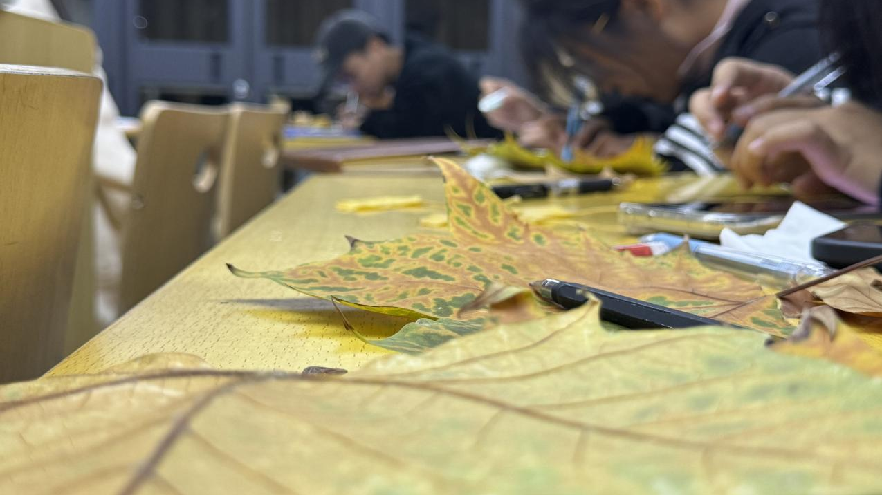 活动前夕,团支书周李想向同学们分享叶雕非遗技艺相关知识,精美的图案与树叶的天然纹理、色彩相融合,深深吸引了大家。同学们纷纷在校园中寻觅心仪的落叶,为创作做足准备。活动当日,同学们携带着精心挑选的落叶准时到场。