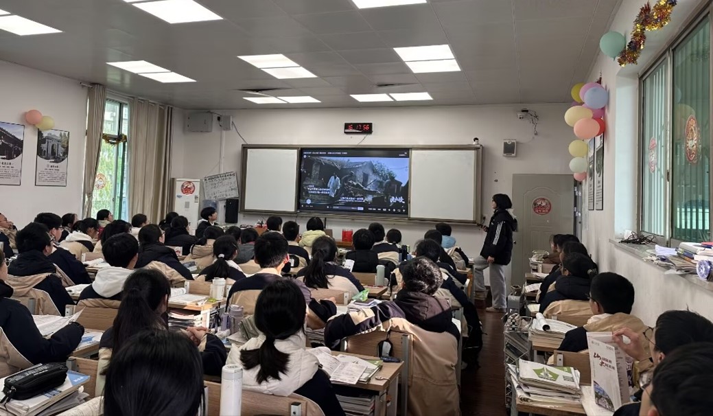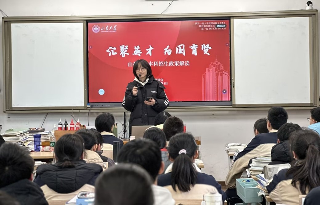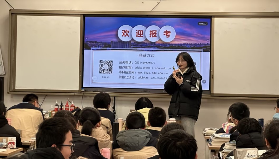 在此次回访活动中,杜金穗首先向同学们介绍了自身情况,并分发了含有山大招生政策的折页,让同学们自行了解,增强了学生对山东大学的好奇心。随后,她播放了以山大校训为主题的宣传片,初步展示了山东大学历代学子求学钻研的精神。台下学生认真观看宣传片,表现出对山东大学的兴趣。