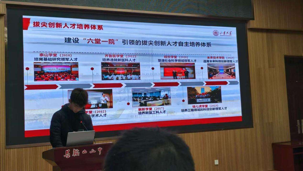 当日上午9时,母校回访活动在安徽省马鞍山市第二中学会议室准时举行。首先,实践队队员们通过精心制作的视频,展示了山东大学的校园风貌、教学设施和丰富的校园生活,让学生们对山东大学有了初步的印象。随后,队员们详细介绍了山东大学的历史沿革、学科优势和师资力量,重点讲解了数学、临床医学等王牌专业的特色与发展前景,激发了学生们对山东大学的浓厚兴趣。