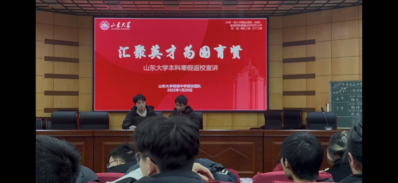 下午,回访活动在桐城中学多功能厅正式开始。在介绍环节,黄波等山东大学学子从山东大学的校园文化、专业特色、日常学习生活等多个角度,进行了细致的分享。通过生动讲述和真实案例,他们将山东大学作为“双一流” 高校的独特魅力与深厚底蕴展现出来,让现场的同学们对大学生活充满了憧憬。