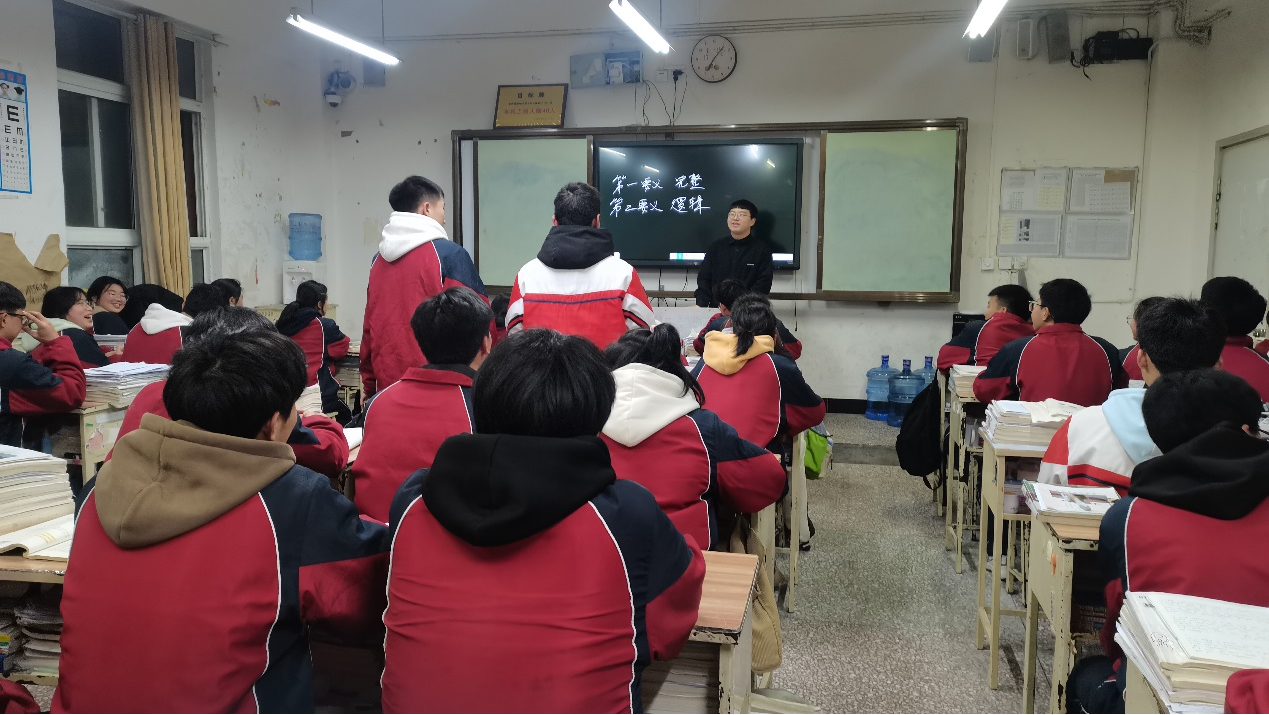 当日21点10分,杨耀涵来到高三(9)班,按备课计划进行试题讲解。罗元碧到场听课。在课堂上,杨耀涵结合罗元碧的教学技巧,用轻松诙谐的语言、生动具体的事例,对试题涉及的知识点进行深入浅出的讲解。面对同学们的提问,杨耀涵用扎实的知识储备和熟练的解题方法认真解答,力求让每一位提问的同学都能得到满意的答案。