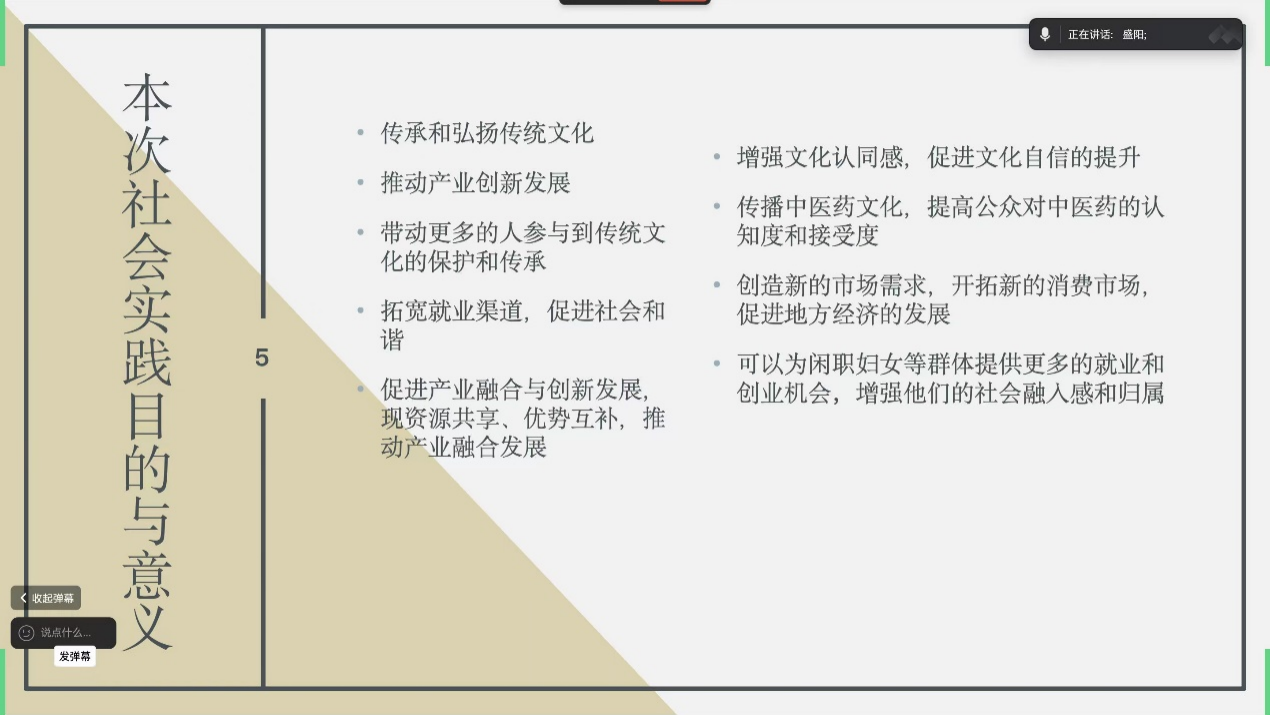 最后,盛阳总结道,本社会实践项目的优势在于融合传统与新潮,打造出独特产品,将钩织工艺与中药结合,打破传统产品的单一模式,创造出兼具实用性、美观性和功能性的全新产品。同时,由于钩织工艺和中药都具有深厚的文化底蕴,两者的结合使产品更具丰富的文化内涵,从而提升品牌价值。除此以外,本次社会实践能够带动相关产业的发展,拓宽就业渠道,创造更多的就业机会。