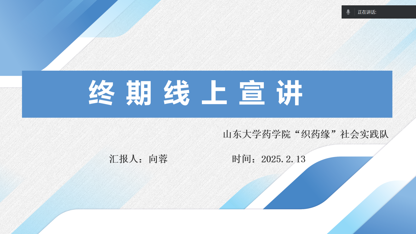 为整理总结本次社会实践的成果,米乐“织药缘”社会实践队于2月13日晚20时开展了线上终期总结会议。本次会议由实践队队长向蓉主持,全体实践队成员参加。