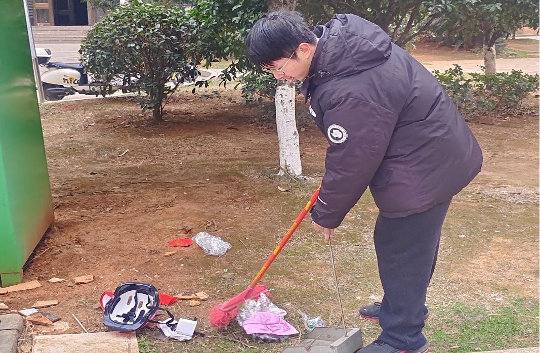为增强社会责任意识,弘扬劳动精神,米乐劳动荣光实践队队员占恒正于2月14日参与社区环境治理活动,与社区工作人员共同清洁社区环境,传递文明新风。
