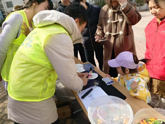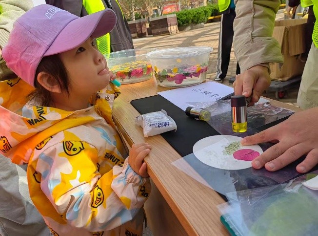 在此次志愿活动中,志愿服务队分设为三组,且各自负责开展了不同的特色活动。在植物拓印体验工坊处,志愿者引导居民利用新鲜植物,通过锤打、拓染等多道工序,亲手制作出富有创意的拓印作品,从而将叶片经络化作永恒印记。且在活动期间,社区居民也热情高涨,踊跃参与到了现场制作中。