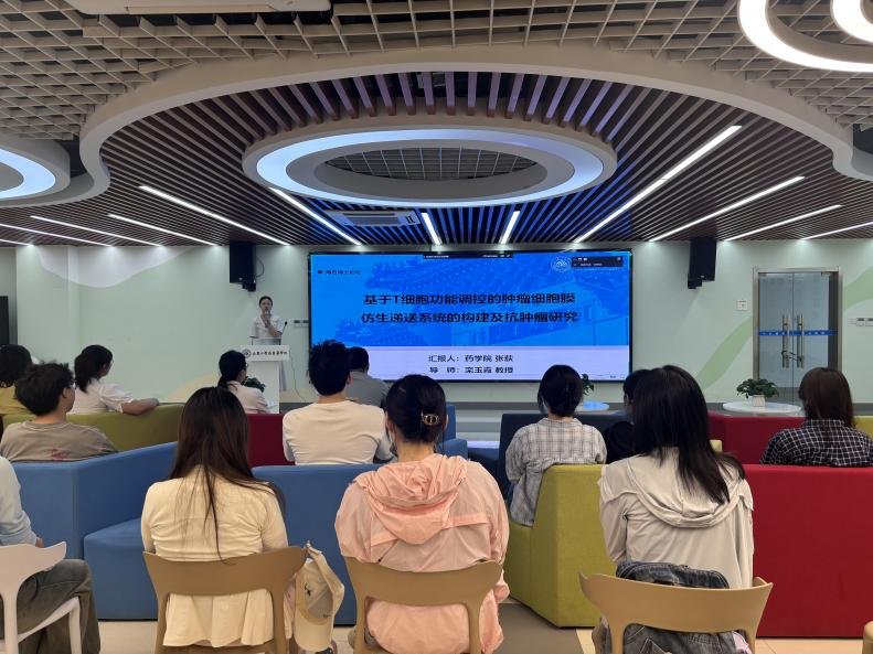 药剂学专业博士生张荻以“基于T细胞功能调控的肿瘤细胞膜仿生递送系统的构建及抗肿瘤研究”为题,聚焦于多功能T细胞免疫应答调控,介绍了化合物、蛋白、核酸及基因治疗药物递送方面的相关研究成果,鼓励同学们在科研过程中要敢想敢做,时刻保持好奇心和持续学习的态度。