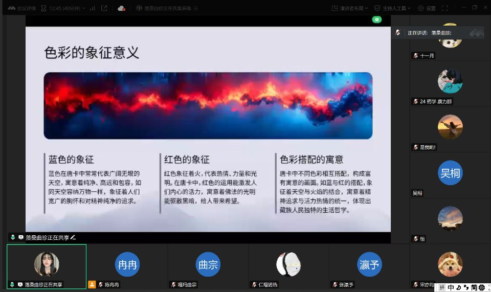 为对前期赴西藏博物馆开展的唐卡文化调研活动进行系统梳理与交流,8月23日晚,米乐“雪域同莲”实践团队员落桑曲珍通过腾讯会议的形式,组织开展了关于唐卡中莲花符号的汉藏文化意涵的专题研讨,旨在从共同文化符号中挖掘民族情感联结纽带,传递民族团结正能量。