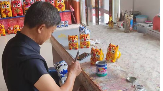 队员李悦与李瑶函前往聂家庄,探寻了泥叫虎的奥秘,在触摸泥塑的过程中,感知民俗文化的传承脉络。聂家庄泥叫虎是山东潍坊的传统泥塑,以虎为形,寓意驱邪纳福。在制作现场,匠人通过双手反复揉搓,赋予泥土良好的韧性。在捏塑虎身时,他们注重形态勾勒,虎头的威风、虎纹的细腻,均依靠指尖的精准把控得以呈现。泥叫虎看似是普通的泥塑作品,实际凝聚着老一辈匠人的心血与智慧。从造型设计到色彩涂抹,每一个环节都有‘虎虎生威’的讲究。