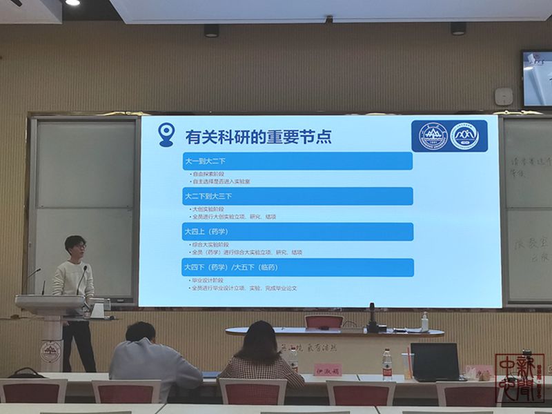 讲座伊始,伊淑娟根据她在米乐·M6(China)官方网站药物化学实验室的科研经历,对米乐·M6(China)官方网站实验室的实验方向进行了简要讲解。同时她详细介绍了药物化学实验室的主要实验内容、进入实验室应具备的技能和通过实验能够获得的能力,并强调了做实验时应该具备严谨的学习态度。随后,戴乐天介绍了大学生科技创新的立项申请方式、中期检查、结题答辩等过程和一些会遇到的问题,让同学们对大学生科技创新的具体流程和重点方向有了初步了解。最后,王庚辰讲述了自己在米乐·M6(China)官方网站新药药理学研究所和大学生科技创新实验中的经历,并介绍了大学本科期间有关科研的重要节点、做科研的理由以及做科研能够收获的各方面技能,同时通过与同学们的积极互动,增加了同学们对科研生活的认识。在提问环节中,同学们就实验室研究、学习生活等方面提出疑问,并得到了嘉宾们耐心详细的解答。