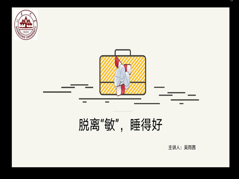 吴雨茜以“药你好梦,药你脱敏”为主题,从失眠定义与症状、失眠药物的介绍、过敏症状和过敏药物的介绍四个方面展开介绍。她强调药物的伤害性无法避免,用安眠药前一定要仔细阅读说明书或咨询相关医师,不可擅自用药并且严格控制剂量。同时,吴雨茜建议从药食同源方面缓解失眠症状,列举了小米、苹果、热牛奶等助眠食物。