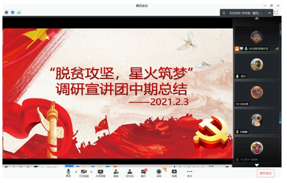 2月3日晚8时,米乐“脱贫攻坚,星火筑梦”调研宣讲团于线上举行了中期工作总结会议。会议由队长安佳琪主持,实践队全体队员参加。