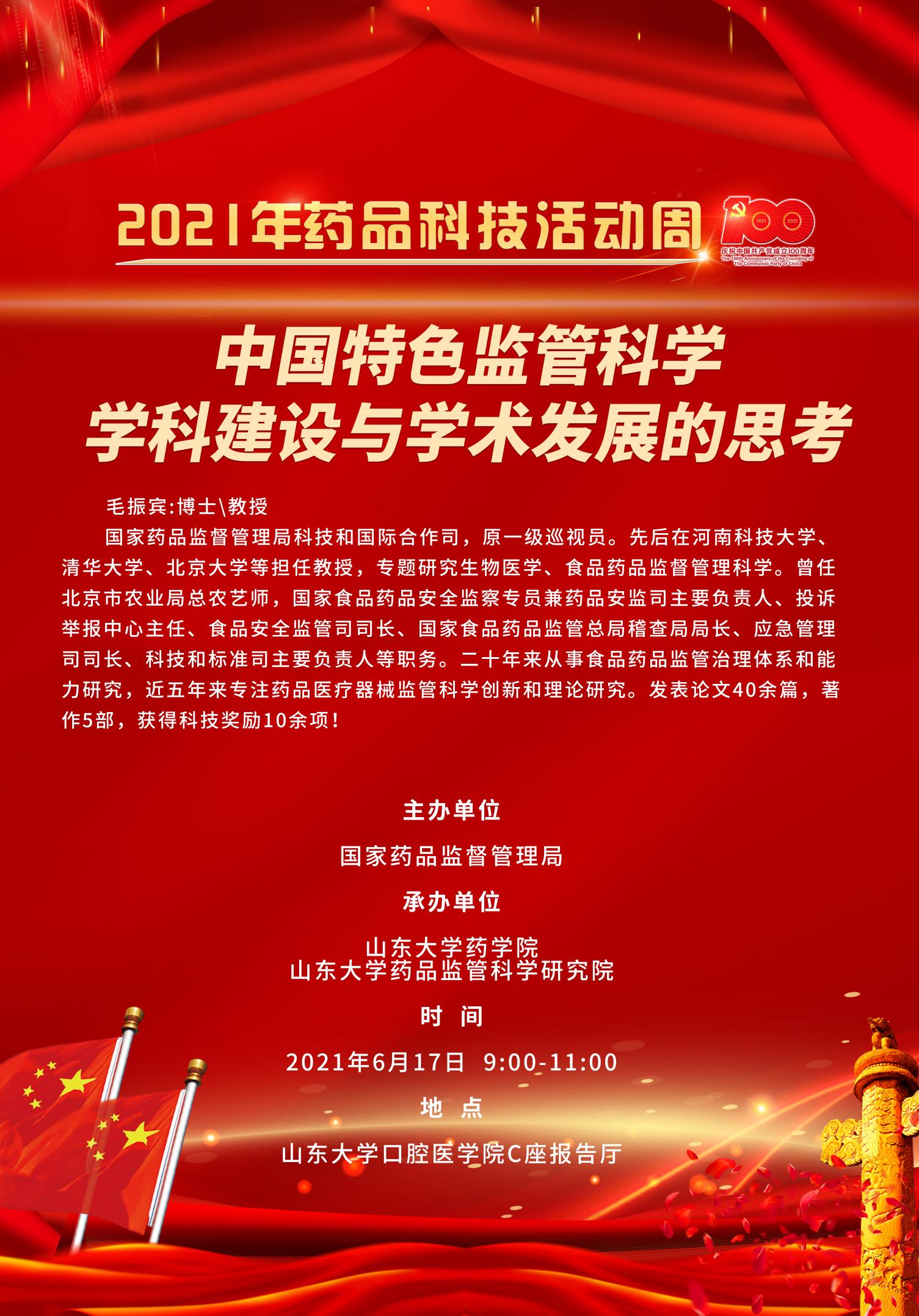 为进一步推进药品监管科学学科建设,密切跟踪国际药品监管前沿,更好地进行药品监管科学研究,同时,积极响应国家药监局《关于开展2021年“药品科技活动周”的通知》精神,进行药品监管科学科技科普宣传,兹定于6月17日上午在山东大学趵突泉校区举办第二期“齐鲁药品监管科学高峰论坛”。届时,将邀请国家药监局科技与国际合作司原一级巡视员毛振宾教授作专题报告。诚邀各位专家学者莅临交流。
