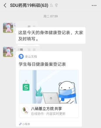各团支部内部开展了丰富的主题团日活动。通过每日健康汇报,实时掌握同学健康信息;通过每日学习打卡,充分利用假期充实提高自己;通过学习疫情防控知识,做好个人和家庭防控。2019级科硕班团支部组织开展“湖北加油,中国加油—众志成城送祝福”活动,以手写的祝福,为武汉、为中国加油;2018级药学3班团支部积极开展“战疫情,山大学子说”等活动,鼓励同学们积极参与投稿;2018级临床药学班、2019级1班、3班、4班团支部通过多种社交媒体及时了解疫情最新情况、掌握疫情发展动态;2019级2班团支部自发签署疫情防控承诺书,自觉提高防范意识,表明对防控疫情的决心,为防控行动作出有力保障。