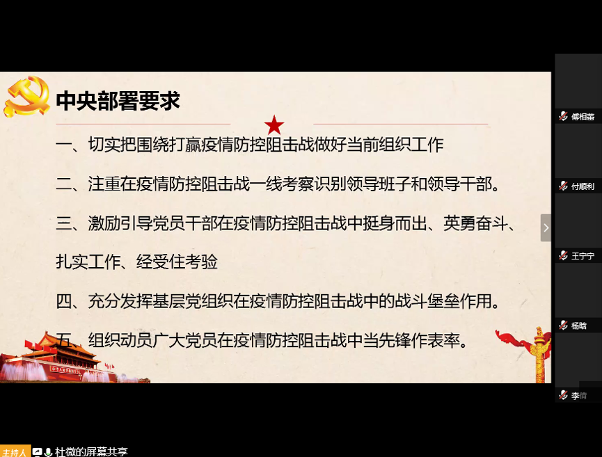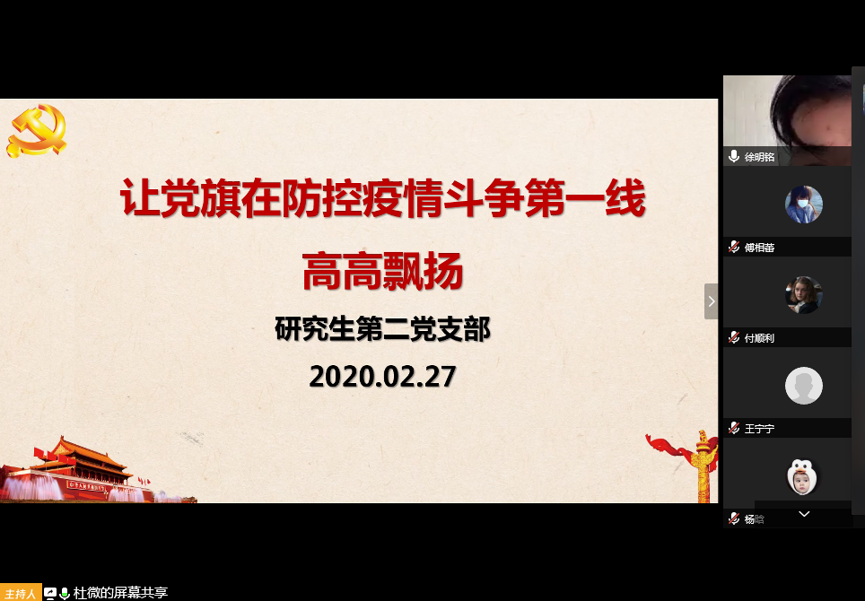 2月27日下午,米乐·M6(China)官方网站研究生第二党支部开展线上主题教育活动,活动主题为“让党旗在防控疫情斗争第一线高高飘扬”,党支部全体党员、入党积极分子参加会议,会议由党支部书记杜微主持召开。