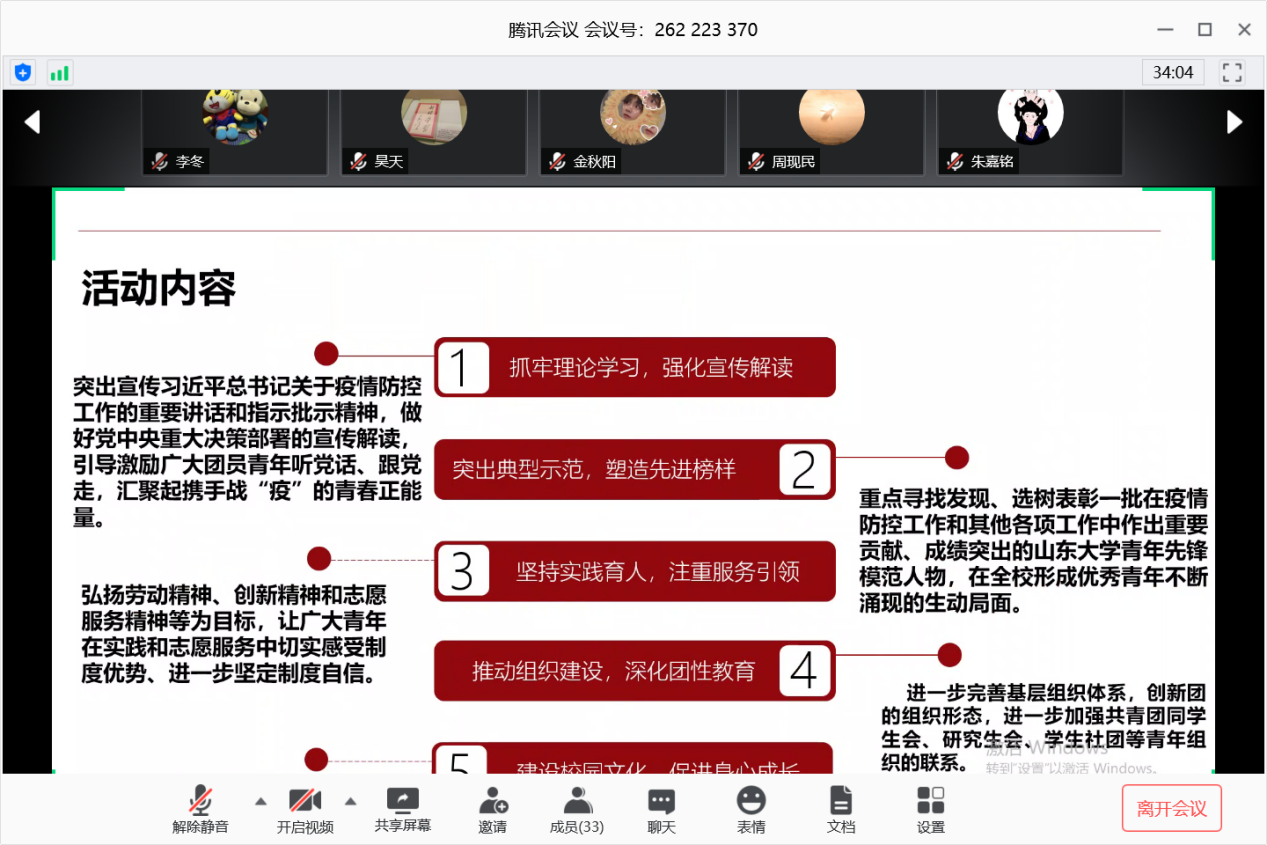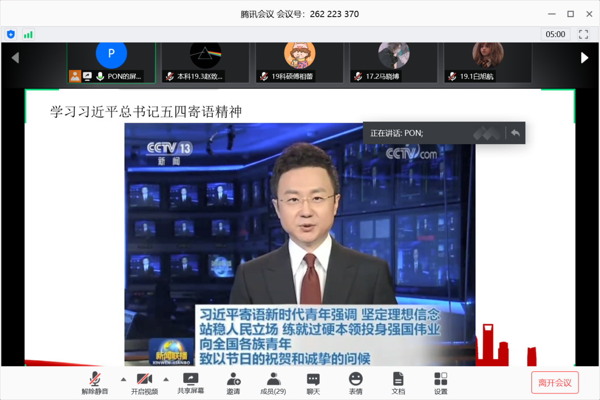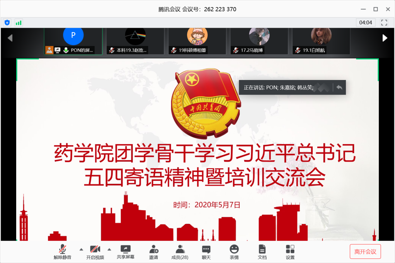 首先,与会成员集体学习了习近平总书记五四寄语精神,分享学习体会,共话青春担当。2019级科硕班团支书傅相蕾分享道:“作为医药学科研究生,扎根专业领域,投身实用科研,才能为做好健康中国梦这场接力赛的传递者而奋斗。”2015级临床药学班团支书韩丛笑谈到:“我们要进一步发挥团支部的堡垒作用和凝聚力,协助学院做好各项工作,为同学们渡过特殊时期保驾护航。”2016级临床药学班团支书张馨方感慨:“习近平总书记的寄语是对青年一代的殷切希望,我们将以习近平总书记寄语精神为指引,传承五四精神,砥砺前行,争做新时代担当有为的青年人。”2017级药学二班团支书马晓博谈到:“在疫情中,青年人用实际行动证明自己是好样的,接下来我们也会牢记书记嘱托,勇担时代使命。”2018级临床药学班团支书王湘月结合团支部工作,探讨了同学们在疫情期间学习上、生活上遇到的问题。2019级药学一班团支书白旭航分享道:“今年的五四是2019级学生进入山大校园后的第一个五四青年节,同学们开始真正地以一个青年人的姿态来审视自我,要求自我。作为青年的我们一定要直面挑战,主动化解问题和困难,在真抓实干中不断发展,在真学真练中不断成长。”随后白旭航、王湘月、林行刚分别从团支部、社团、学院层面分享了素质拓展培养系统的操作流程及注意事项。
