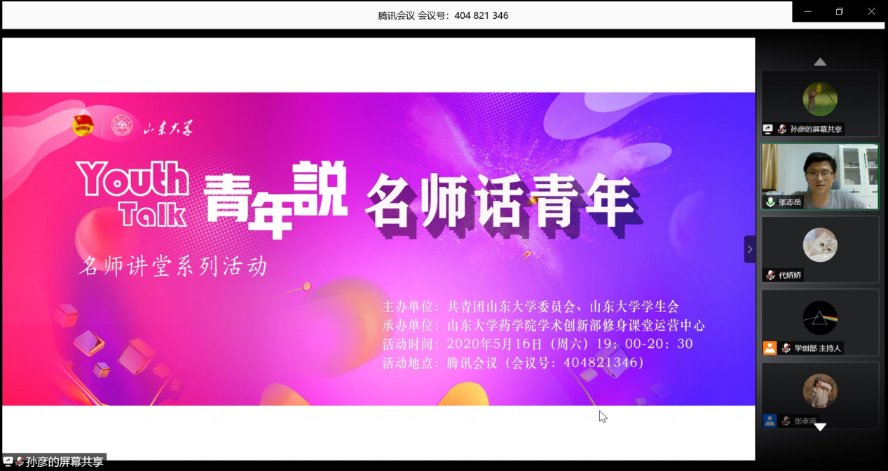 2020年5月16日,修身课堂“Youth Talk”青年说活动于腾讯会议线上平台举办。山东大学药剂学专业博士生导师张志岳教授从大学生活、就业经历、科研工作等方面分享了自己的成长经历。米乐全体本科生参与了本次活动。