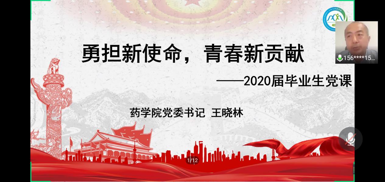 首先,王晓林书记以“勇担新使命,青春新贡献”为主题,向全体党员上了一堂别开生面的党课。王晓林书记以王进喜、焦裕禄、雷锋以及在抗击新型冠状病毒肺炎疫情中的优秀共产党员为例,激励毕业生党员要以优秀的共产党人为榜样,传承红色基因,始终要有坚定的信仰,坚守党的初心,努力为中国人民谋幸福,为中华民族谋复兴。他通过讲述张恩宏的故事,鼓励党员同志学习“我是党员我先上”的精神,在健康中国的建设中,秉承药学人的精神,勇于担当,向逆行者学习,牢记责任和使命,在药学建设中书写新的辉煌;此外,他讲述了习近平总书记青春的奋斗史,指出青年党员要努力实现人生价值,不怕吃苦,无私奉献,常怀感恩之心,常思奋斗之志;最后,他强调全体党员要努力传达青春正能量,解读“向前、向上、向善”等关键词,引导党员同志树立终身学习的思想,不断求知探索,拓展自己的知识面,修身向善,提高自身修养,坚守党性标准,彰显党员本色,展示党员形象。