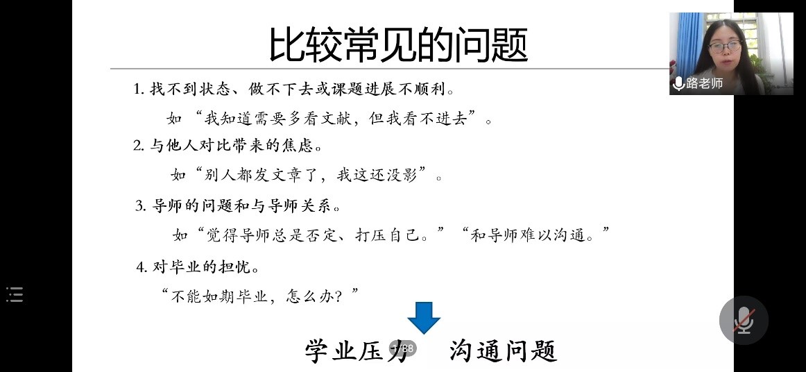 路老师围绕调控压力和学会沟通两项内容,列举了研究生阶段通常遇到的各种常见压力,并分析压力产生的原因。她指出,调控压力首先需要我们觉察压力,其次是改变认知或思维模式,然后选择合适的应对方式。关于沟通方面,路老师引用了萨提亚五种沟通模式的理论,深入分析了我们在沟通中常见的问题,并提出了许多建设性建议。与同学们互动时,路老师分析了同学们未来学习和生活中可能出现的问题,提出了应对策略。