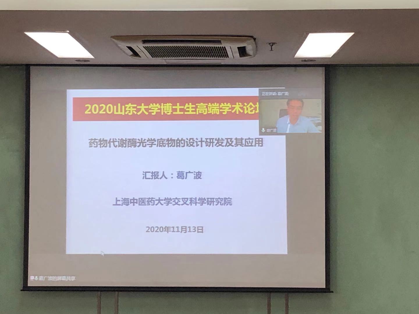 2020年11月13日,由米乐主办的“2020年山东大学博士研究生高端学术讲坛”在米乐·M6(China)官方网站科研楼报告厅举行。上海中医药大学交叉科学研究院副院长、国家优秀青年基金获得者葛广波教授在线上进行了题为“药物代谢酶光学底物的设计研发及其应用”的学术报告并与米乐·M6(China)官方网站师生交流。米乐·M6(China)官方网站师生参加本次讲坛。讲坛由米乐·M6(China)官方网站聂磊老师主持。