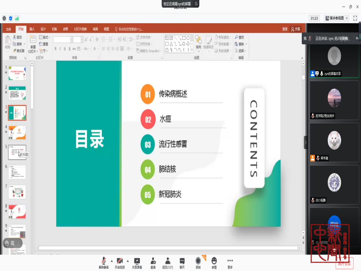本次讲座围绕“冬季常见传染病的防控”展开。张雅楠依次从病原学特征、临床表现、流行特征、治疗与护理、防控措施五个方面对水痘、流行性感冒、肺结核等传染病进行了具体讲解。随后,她针对不同疾病的特征进行有侧重性的讲解,使同学们对不同的传染病特征有了更全面的认识。最后,她又针对近期新冠肺炎疫情的境外输入案例对新型冠状病毒进行了详尽介绍,对疫情防控常态化过程中一些易于忽略的知识点作了详细说明。张雅楠强调,作为医学生,同学们应抱着更加慎重的态度对待生活中的疾病,尽自己所能去宣传疫情防控的相关知识,共同助力防疫工作取得最终胜利。