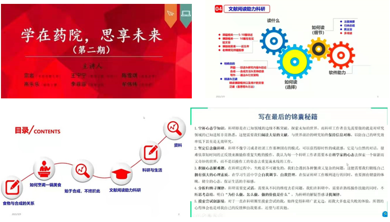 主讲嘉宾们通过自身经历向大家分享了文献阅读方法、课题方向选择、实验注意事项、论文写作技巧等各个方面的经验与感受,同时也向大家交流了自己科研道路的心得体会与成长经验,要保持乐观的心态和强健的体魄,学会用积极的眼光去看待挫折、用合适的方法去化解压力,既要善于思考,注重总结自己独特的方式方法,又要有坚忍不拔、永不言败的品格和毅力。分享过后,同学们也积极提出问题发表自己的看法,进行互动交流。最后,张诗迎对此次分享会进行总结,鼓励大家要以这次分享会为契机,调整好心态,踏实认真,走好走实脚下的每一步路,努力成为德智体美劳全面发展的新时代药学人才。