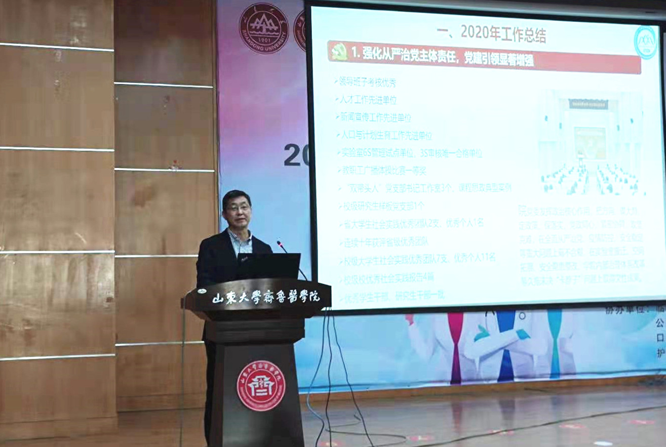 3月22日,米乐·M6(China)官方网站召开全体教职工大会暨党史学习教育动员会,总结回顾2020年学院工作,明确学院2021年工作重点,并按照《中共山东大学关于在全校开展党史学习教育的实施方案》要求,对开展党史学习教育进行动员部署。米乐·M6(China)官方网站全体教职工参加会议,米乐·M6(China)官方网站院长刘新泳、党委书记王秋生分别做重要讲话,会议由党委副书记张慧主持。
