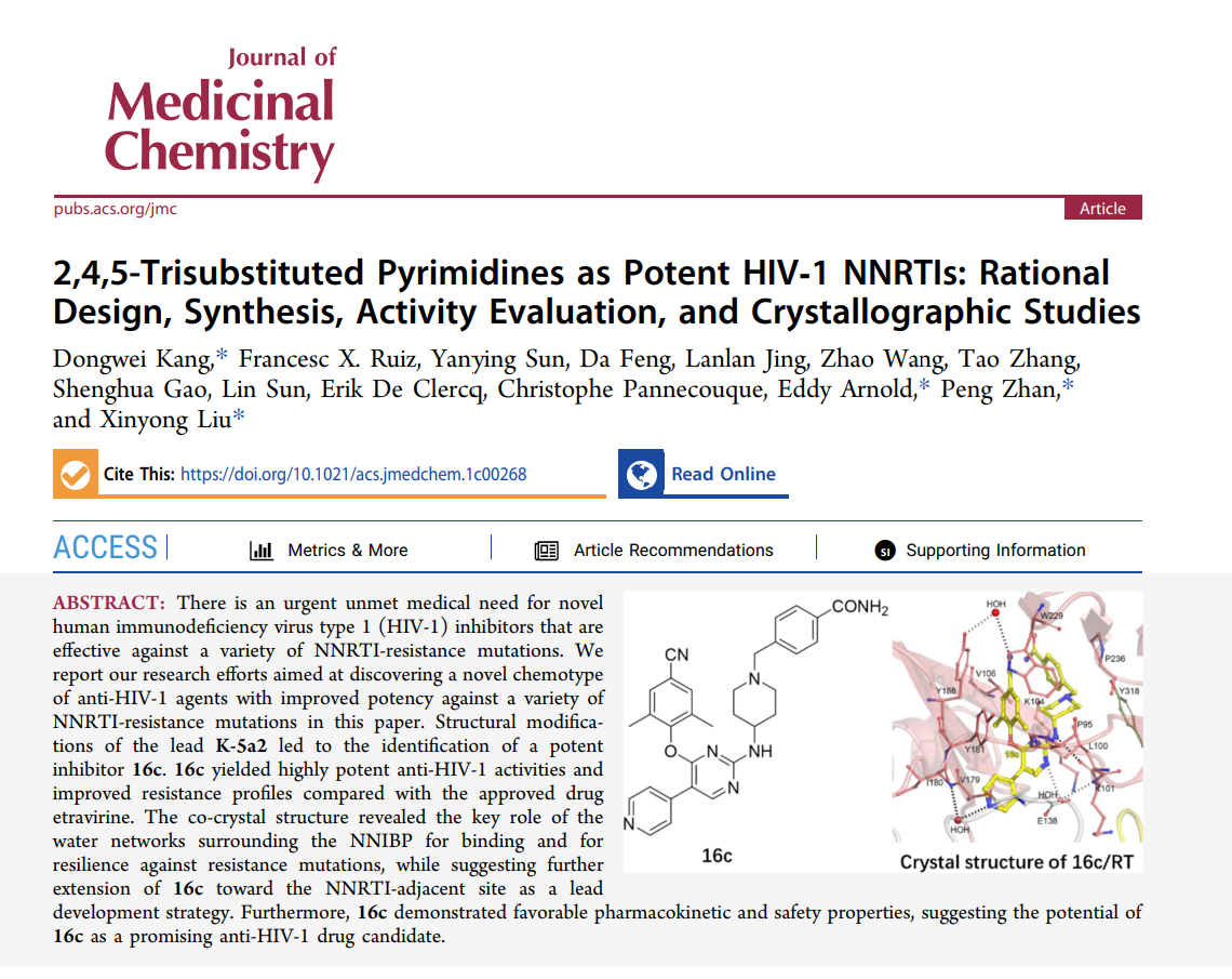 上述研究内容已发表于美国化学会药物化学领域权威期刊J Med Chem 上,米乐康东伟研究员为论文第一作者,刘新泳教授、展鹏教授及Eddy Arnold教授为本论文的共同通讯作者。该研究得到国家自然科学基金和山东省重大创新工程项目的支持。