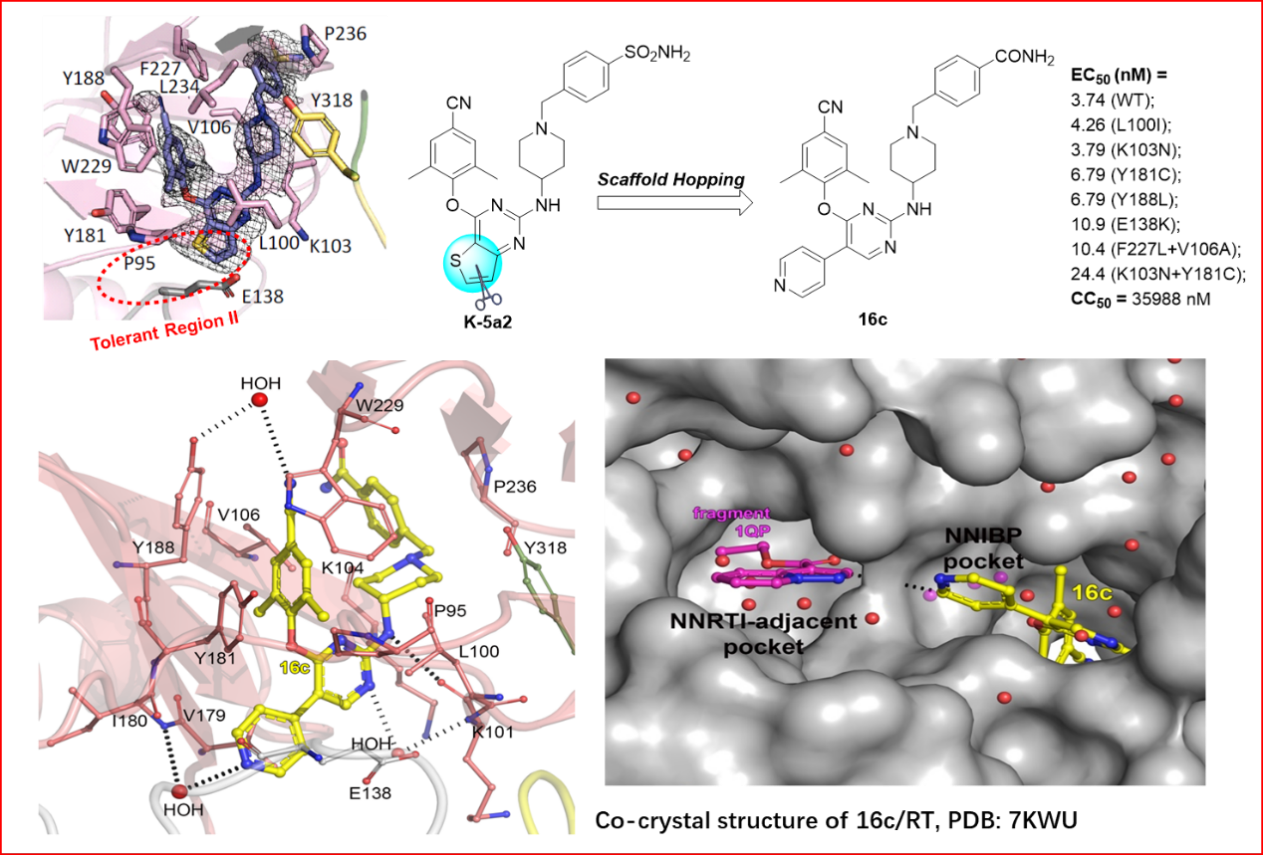 基于前期的研究基础和建立的DAPY类NNRTIs构效关系,近日,刘新泳团队与比利时鲁汶大学Christophe Pannecouque教授、美国罗格斯大学Eddy Arnold教授合作,设计合成了一系列2,4,5-三取代嘧啶类NNRTIs,通过在先导化合物K-5a2的中心嘧啶环C5位引入结构多样的芳杂环(图1),以进一步的探讨NNIBP可容纳区域II的构效关系,发现高效抗耐药性的HIV-1 NNRTIs候选药物。结果显示,化合物16c表现出最优的抗病毒活性,对HIV-1野生株(IIIB)和临床常见突变株(L100I、K103N、Y181C、Y188L、E138K、F227L/V106A和K103N/Y181C)的活性(EC50= 3.74 - 22.4 nM)均优于第二代上市药物依曲韦林。此外,16c的细胞毒性很低(CC50= 36.0 μM),对HIV-1野生株和突变株均具有很高的选择性指数。