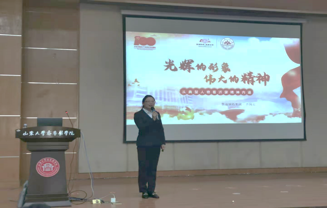 齐凤云从沂蒙精神的深刻内涵、沂蒙精神的形成发展、时代楷模的精神传承三个篇章深度解读沂蒙精神。齐凤云首先介绍了井冈山精神、延安精神、西柏坡精神、沂蒙精神是党和国家的宝贵精神财富,阐释了沂蒙精神的人民自觉性特点,深入剖析了沂蒙精神的内涵。大家通过视频回首了那段热血沸腾的峥嵘岁月,了解了沂蒙精神的形成与发展过程。随后,她通过讲述朱村抗战、大生产运动、“沂蒙母亲”王换于、女子火线桥、九间棚艰苦创业等鲜活感人的事例,生动展现了优秀党群关系典范——水乳交融,生死与共的沂蒙精神,诠释了“吃苦耐劳、勇往直前、永不服输、敢于胜利、爱党爱军、开拓奋进、艰苦创业、无私奉献”的沂蒙精神。齐凤云表示,沂蒙精神在中国共产党的领导下诞生,经历了血与火的锤炼,沂蒙精神的发展过程深刻体现了随时代脉搏同频跳动,凝心聚力,成风化雨的特点。最后她以时代楷模的精神传承为中心讲述了鲁南制药集团原董事长、党委书记、总经理、时代楷模赵志全同志将青春年华献给壮丽事业的先进事迹,使现场观众对沂蒙精神有了更加深刻的认识与理解。