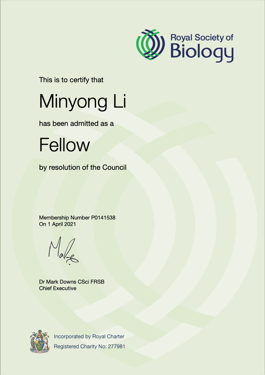 日前,米乐·M6(China)官方网站李敏勇教授收到英国皇家生物学会颁发的证书,当选为英国皇家生物学会会士(Fellow of the Royal Society of Biology,FRSB)。